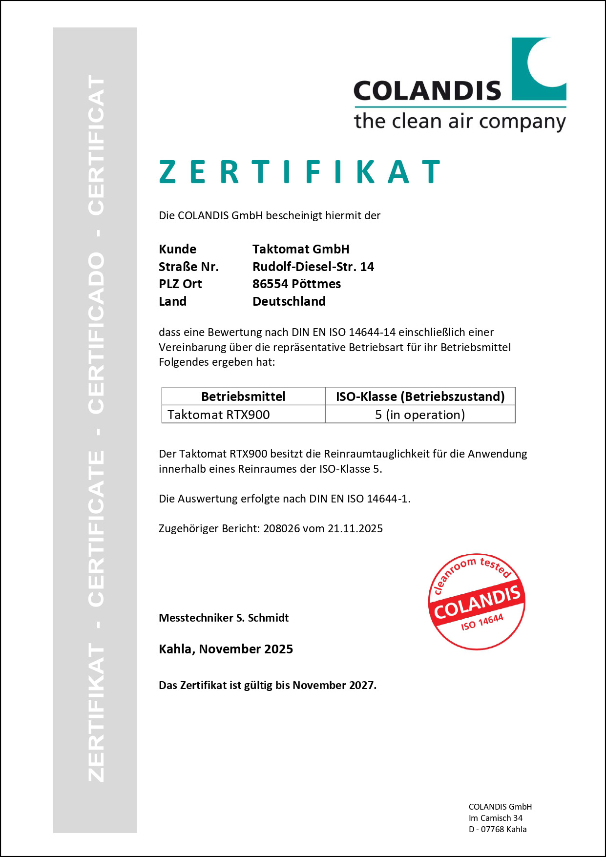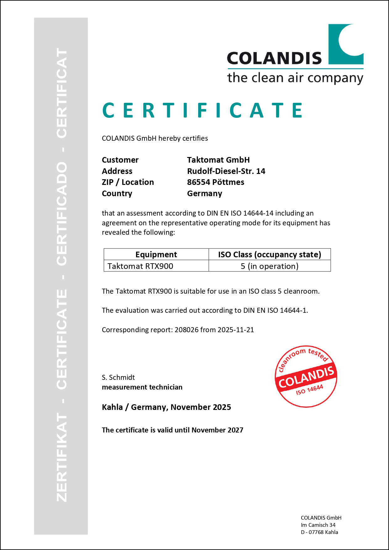 Certificado Sala limpia clase RTX ISO 5 Alemán